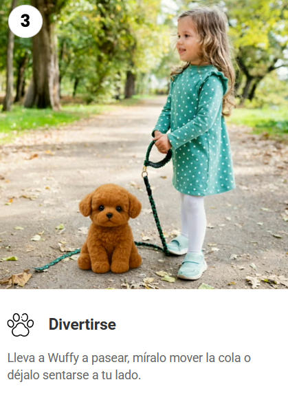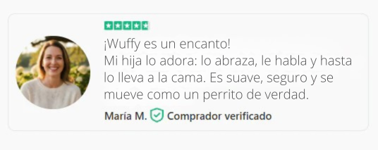 ¡nos encanta wuffy! se lo compramos a nuestra hija pequeña y hasta a nosotras nos encanta jugar con él 😂 ¡es monísimo! se comporta como un cachorrito de verdad y las carcajadas de nuestra pequeña no se comparan con el precio tan bajo que pagamos por él 😂 ¡me encanta!